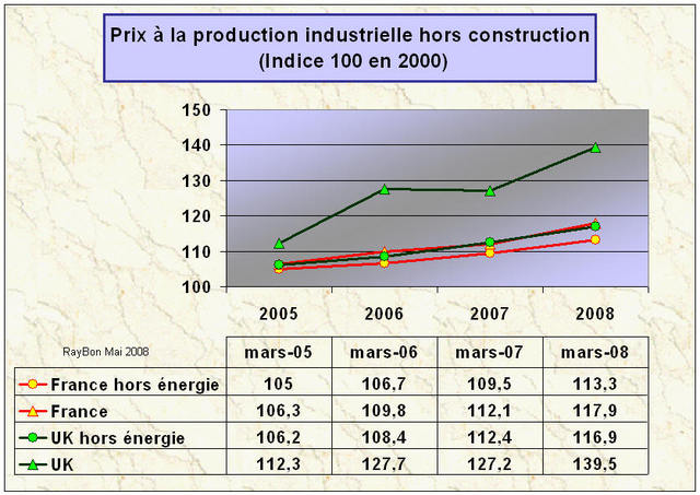 Les indices des prix à la production industrielle publiés par Eurostat en témoignent. Il suffit de comparer les indices (base 100 en 2000) des prix industriels hors construction avec et sans énergie et de les comparer avec ceux de la France en mars 2008 (FIG.). Alors que la variation de l’indice de la France comprenant les prix de l’énergie (17,9%) est majoré d’un tiers environ par rapport à la variation des prix hors composante énergétique (+13,3%). Pour la Grande-Bretagne les variations des prix à la production industrielle sont multipliés par 2,3 (39,5/16,9) par rapport à celle de l’indice sans composante énergétique.