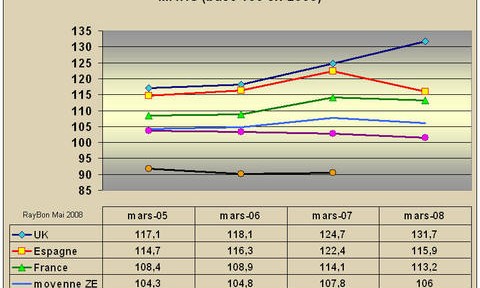 Il y a 30 points de différence entre l’Allemagne dont la consommation décroît de façon monotone depuis trois ans, et la Grande-Bretagne dont la croissance de la consommation est brillante (+7 points de croissance entre Mars 2007 et Mars 2008) malgré une inflation énergétique inquiétante. La consommation en volume de l’Allemagne n’a quasiment pas changé en 8 ans! Beau pays où la balance commerciale est largement excédentaire mais où les citoyens moyens ne voient pas évoluer leur pouvoir d’achat et où 22% sont des travailleurs pauvres (Institut für Arbeit und Qualification, Avril 2008).