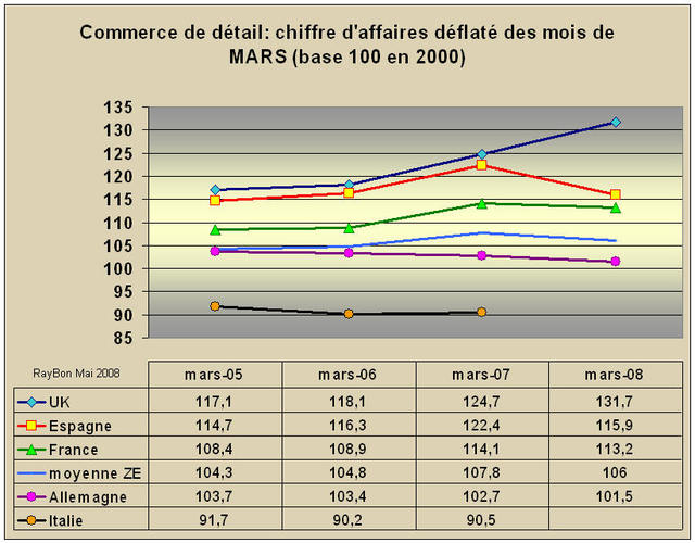 Il y a 30 points de différence entre l’Allemagne dont la consommation décroît de façon monotone depuis trois ans, et la Grande-Bretagne dont la croissance de la consommation est brillante (+7 points de croissance entre Mars 2007 et Mars 2008) malgré une inflation énergétique inquiétante. La consommation en volume de l’Allemagne n’a quasiment pas changé en 8 ans! Beau pays où la balance commerciale est largement excédentaire mais où les citoyens moyens ne voient pas évoluer leur pouvoir d’achat et où 22% sont des travailleurs pauvres (Institut für Arbeit und Qualification, Avril 2008).