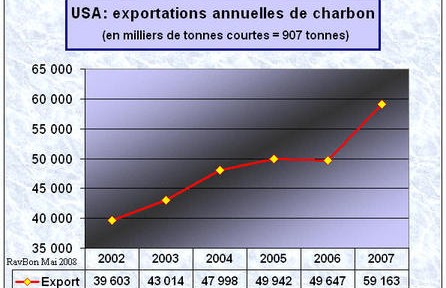 Le monde ne manque pas de charbon, il manque de moyens de manutention pour l’extraire des mines, l’acheminer dans les ports et le charger sur des vraquiers. L’Afrique du Sud et l’Australie n’arrivent plus à suivre la demande asiatique et européenne. Alors les pays importateurs se retournent vers les USA dont les exportations de charbon sont en pleine expansion (FIG.) bien que ne représentant encore que 5% de la production américaine.