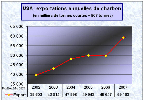 Le monde ne manque pas de charbon, il manque de moyens de manutention pour l’extraire des mines, l’acheminer dans les ports et le charger sur des vraquiers. L’Afrique du Sud et l’Australie n’arrivent plus à suivre la demande asiatique et européenne. Alors les pays importateurs se retournent vers les USA dont les exportations de charbon sont en pleine expansion (FIG.) bien que ne représentant encore que 5% de la production américaine.