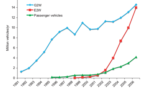 Quatorze millions de bicyclettes assistées électriquement et autres deux roues électriques vendus en Chine en 2006 (FIG. courbe en rouge). Autant que de deux roues de types motocyclettes ou scooters à moteurs thermiques (FIG. courbe bleue). Ce phénomène de croissance exponentielle démarré en 1999 et 2000, fait l’objet d’études universitaires de la part de l’Institut des Transports de l’Université de Californie, tellement cette croissance est rapide. Les raisons d’après les auteurs reposent sur une forte demande avec le bannissement dans certaines villes des deux roues à moteur, la détérioration de la qualité des transports publics et surtout une industrie d’assemblage très décentralisée, à partir de sous ensembles standardisés.