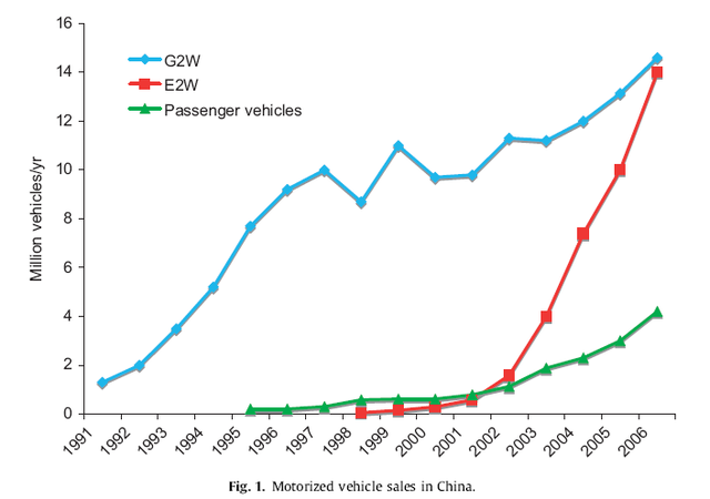 Quatorze millions de bicyclettes assistées électriquement et autres deux roues électriques vendus en Chine en 2006 (FIG. courbe en rouge). Autant que de deux roues de types motocyclettes ou scooters à moteurs thermiques (FIG. courbe bleue). Ce phénomène de croissance exponentielle démarré en 1999 et 2000, fait l’objet d’études universitaires de la part de l’Institut des Transports de l’Université de Californie, tellement cette croissance est rapide. Les raisons d’après les auteurs reposent sur une forte demande avec le bannissement dans certaines villes des deux roues à moteur, la détérioration de la qualité des transports publics et surtout une industrie d’assemblage très décentralisée, à partir de sous ensembles standardisés.