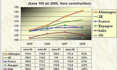 La production industrielle, hors construction, de la Zone Euro, au mois de Mars, ressort en progression annuelle de 2% tirée par les productions d’énergie (+5,8%) et de biens d’investissement (+4,1%), mais fortement freinée par les productions de biens de consommations durables (-3,2%) et non durables (-0,9%). Les pays du Sud sont en pleine contraction avec le Portugal (-6,2%), l’Espagne (-2,6%) et l’Italie (-2,5%), la France stagne (+0,3%), l’Allemagne poursuit sa croissance (+5,2%). L’Irlande (+6,9%) et les Pays-Bas (+6,6%) présentent des croissances annuelles remarquables. La Grande-Bretagne stagne depuis des années.