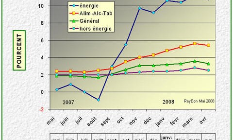 La hausse des prix sur 12 mois dans la Zone euro semble être passée par un maximum au mois de Mars. En effet tirée par une légère détente des croissances des prix de l’énergie et des produits alimentaires cette hausse revient à 3,3% qui était la valeur du mois de Février, en retrait de 0,3 points par rapport à la valeur du mois de Mars. La hausse des prix française à 3,4% est à la moyenne de la Zone.
