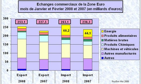 Le dynamisme des échanges commerciaux de la Zone Euro du mois de Janvier qui avait été souligné ici, est confirmé par les résultats à fin Février, publiés par Eurostat. Les exportations et les importations des deux premiers mois 2008 sont en croissance de 11,3%. Les importations sont dopées par les achats de produits énergétiques pour un montant de 60 milliards d’euros (FIG.), en augmentation de 16 milliards d’euros par rapport au mêmes deux premiers mois de 2007 (+36,5%). Les exportations de machines et véhicules à 110 milliards d’euros ont crû de 10%, celles des produits énergétiques à 11 milliards d’euros sont en augmentation de 37%. L’ensemble se traduit par un déficit cumulé de 10 milliards d’euros, bilan tiré vers le bas par un déficit énergétique de 49 milliards d’euros. Pour la France les importations croissent de 13,1% et les exportations de 10,6%.