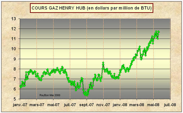L’année 2008 s’annonce pour les cours du gaz de façon totalement différente. Bien qu’il n’y ait aucune pénurie, aucune tension physique sur les approvisionnements de gaz, bien que les stocks aux USA aient repris leur ascension depuis 6 semaines de façon habituelle, les cours du gaz naturel au Henry Hub sont irrésistiblement liés à ceux du pétrole avec un ratio autour de 0,54 (FIG.II). Ces cours sont ainsi passés de 7$ en début 2008 à 11.7 $ cette semaine soit une hausse proche des 70%.