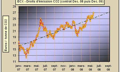 L‘échange de droits d’émissions de CO2, basé sur les réductions de volumes décidées dans le cadre du protocole de Kyoto, a fait l’objet de la création d’un marché très actif en Europe. La plateforme ECX à Londres qui est la plus importante pulvérise chaque mois ses records de volumes échangés. Elle a traité au mois d’Avril plus de 190 millions de tonnes de CO2, soit plus du double de ce qui avait été échangé en Avril 2007. Les cours du CO2 se portent bien (FIG.), ils ont franchi les 27 euros la tonne cette semaine, supportés par des électriciens anglais et allemands qui consomment à tout va du lignite ou du charbon et qui évitent de consommer du gaz, devenu hors de prix avec la financiarisation des cours.