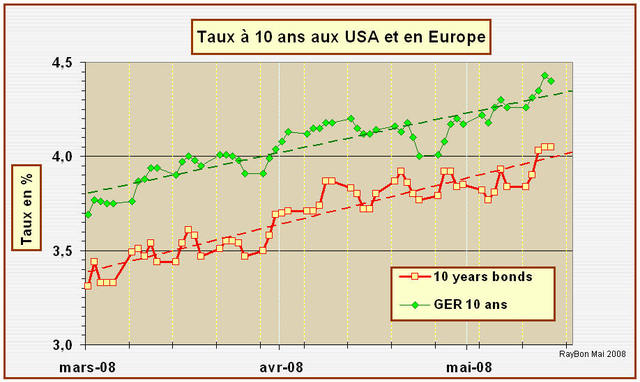 La question de l’arrivée du phénomène inflationniste étant réglée, reste à en prévoir l’ampleur et la durée. A court terme elle va dépendre de la durée de la bulle spéculative qui s’est abattue sur les cours de l’énergie. Ce phénomène entretenu par des financiers sans scrupule qui expliquent, par exemple, ce matin aux USA que les cours du gaz naturel vont monter aux US parce qu’il va faire chaud durant les deux premières semaines de Juin et que l’arrivée de la saison des ouragans est imminente! (Bloomberg) Les citoyens américains vivent dans un vrai climat de propagande financière « énergétique ». Le bon côté de ces exagérations est qu’elles incitent les américains à se préoccuper en particulier, de leur consommation en carburant et en énergie, en général.