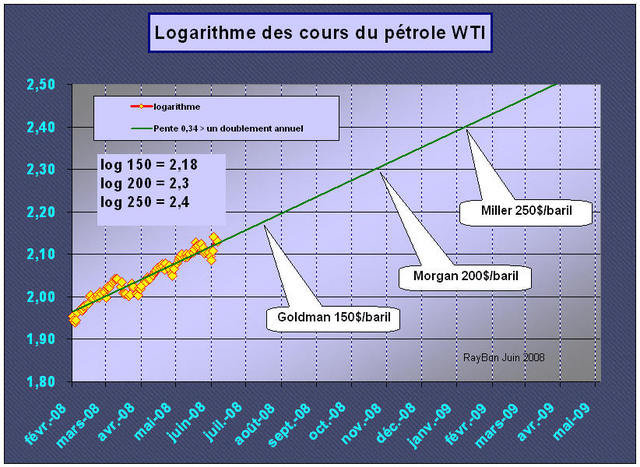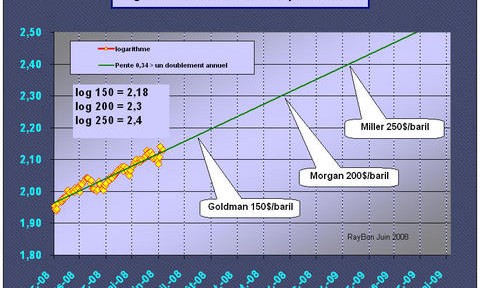150 dollars/baril annonce Jeff Currie de Goldman Sachs, il est repris par Morgan Stanley qui avait déjà parlé de 200$/baril avant la fin de l’année. Mais voila Alexei Miller, le patron de Gazprom, à Deauville a fait monter les enchères, il n’y avait pourtant pas de ventes de yearling, à 250$/baril. Qui va surenchérir? Le ridicule ne tue pas. La montée des cours flatte leur ego, les conforte dans leurs convictions. Plus la prévision est grosse plus l’homme est fort! Je soupçonne certains d’avoir utilisé la régression linéaire logarithmique déjà publiée ici. Je vous la montre à nouveau, actualisée à ce matin. Il n’y a pas de raison que vous ne puissiez vous aussi, faire votre prévision. Allez-y! Vous pourrez ainsi parier sur le prix de votre futur plein d’essence ou celui du prochain remplissage de votre cuve à mazout.Logari1