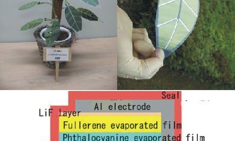 Par dépot sur un substrat en feuille d’Aluminium de plusieurs couches assurant l’adhérence, la formation de charge électrique positive et négative, la collecte de courant, puis d’un fim transparent imperméable à l’eau et à l’oxygène de l’air, il est possible de produire des cellules photovoltaïques organiques de faible coûts en très grande quantité. De nombreux travaux portant sur la nature des composés chimiques (fullerènes, phtalocyanines,…) mis en jeu font l’objet d’une âpre compétition, les propriétés dans le temps du fim transparent soumis au rayonnement solaire et aux intempéries est également un point important. L’avancement des développements permet d’envisager avec ces produits des applications pour l’instant peu exigeantes, de type jouets ou gadgets électroniques. Par exemple, à titre pédagogique, il est possible de construire une plante en pot, bonzaï produisant de l’électricité (FIG.) qui illustre les possibilités d’application de ces produits.