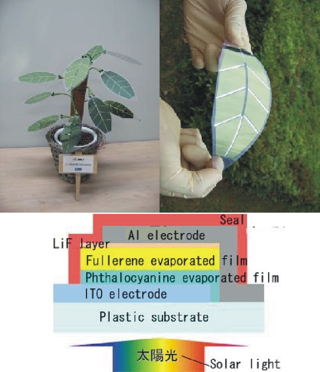 Par dépot sur un substrat en feuille d’Aluminium de plusieurs couches assurant l’adhérence, la formation de charge électrique positive et négative, la collecte de courant, puis d’un fim transparent imperméable à l’eau et à l’oxygène de l’air, il est possible de produire des cellules photovoltaïques organiques de faible coûts en très grande quantité. De nombreux travaux portant sur la nature des composés chimiques (fullerènes, phtalocyanines,…) mis en jeu font l’objet d’une âpre compétition, les propriétés dans le temps du fim transparent soumis au rayonnement solaire et aux intempéries est également un point important. L’avancement des développements permet d’envisager avec ces produits des applications pour l’instant peu exigeantes, de type jouets ou gadgets électroniques. Par exemple, à titre pédagogique, il est possible de construire une plante en pot, bonzaï produisant de l’électricité (FIG.) qui illustre les possibilités d’application de ces produits.