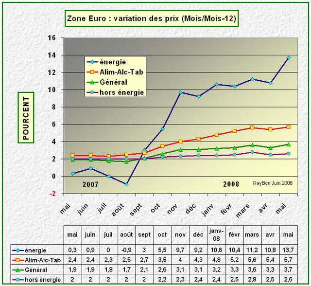 Le taux d’inflation annuel du mois de Mai de la Zone Euro, initialement prévu à 3,6%, ressort finalement à 3,7% tiré vers le haut par les prix délirants de l’énergie qui augmentent en 12 mois de 13,7% (FIG.) le seul poste transport explique 1,8 points de la hausse. La France avec 3,7% se trouve à la moyenne de la Zone Euro, l’Allemagne ressort en dessous (3,1%) et l’Espagne nettement au dessus avec 4,7%. Cette inflation est tout de même inférieure à celle des Etats-Unis qui est ressortie au mois de mai à 4,18% avec un poste énergie en croissance de 17,4%.