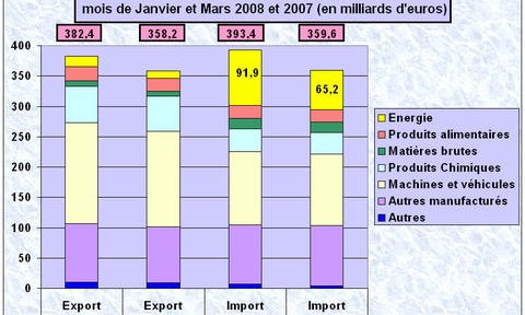 Les importations de la Zone Euro au premier trimestre 2008 (T1) ont atteint 393 milliards d’euros en augmentation 34 mrds euros (+9,4%) par rapport au même trimestre 2007. Ces importations sont essentiellement tirées par les importations de produits énergétiques qui augmentent de 27 mrds euros (+41%) à 92 milliards d’euros (FIG.). Cet impact des importations de produits énergétiques sur les échanges commerciaux, compte tenu de l’augmentation des prix des produits pétroliers et des coûts d’affrêtements, sera encore plus marqué à la fin du mois de Juin. On constate cependant qu’à la fin du T1, la balance commerciale de la Zone Euro n’est pas fondamentalement chamboulée (-11 mrds contre -1 mrd il y a un an), le recyclage des pétrodollars jouant son rôle de feedback positif sur l’activité commerciale. Il faudra donc surveiller deux indicateurs: la facture pétrolière et la balance commerciale pour mesurer la gravité du mal.