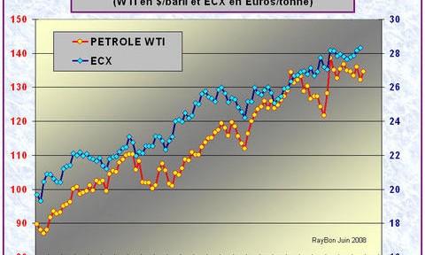 La hausse des prix de l’électricité allemande, impactée par les coûts de l’énergie, couplée à la hausse des droits d’émissions de carbone commence à inquiéter un analyste de la Deutsche Bank. Les prix du gaz de la mer du Nord, du charbon livré dans les ports européens, comme ceux du pétrole ont globalement été multipliés par trois depuis le premier trimestre 2007. Ces augmentations des prix des sources primaires d’énergies ont entraîné une hausse automatique des prix de l’électricité allemande de 13% depuis le début de l’année, après un accroissement de près de 50% en 2007. Or, depuis de le mois de Février 2008, date du début de l’emballement spéculatif des cours du pétrole et du gaz, il se trouve que les prix de droit d’émission d’une tonne de CO2 à Londres (ECX) qui sont passé de 20 euros la tonne à 28 euros la tonne, suivent la même tendance à la hausse que celle du pétrole, avec un coefficient de corrélation de 0,90 (FIG.).