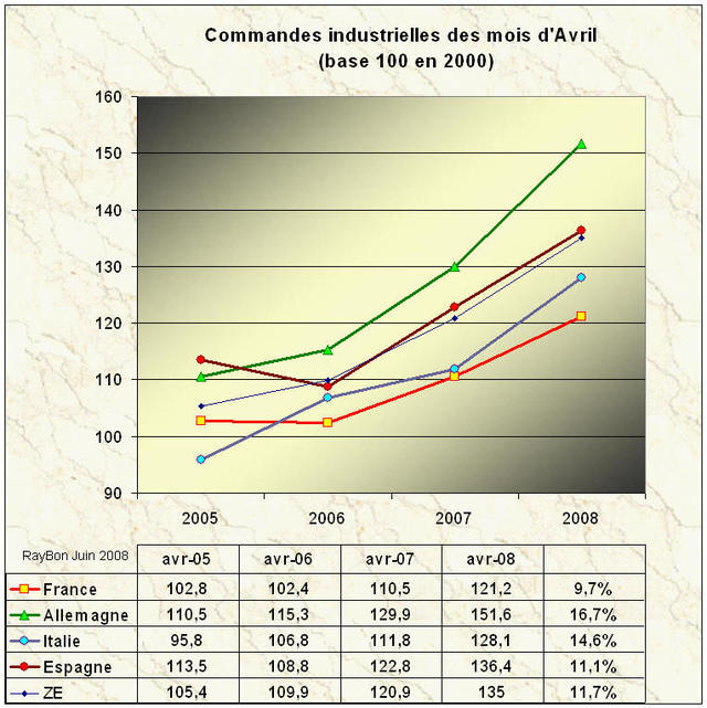Après un premier trimestre d’entrées de commandes à l’industrie globalement satisfaisant pour la Zone Euro, estimé en croissance de 4,4%, les entrées de commandes du mois d’Avril ressortent en hausse de 11,7% par rapport à celles du même mois 2007. Ce résultat porte la croissance sur les quatre premiers mois aux environs de 6%. Pour le mois d’Avril ce sont les commandes de machines et d’équipements, y compris celles destinées aux industries électriques et électroniques, qui tirent le résultat vers le haut. La métallurgie est également bien servie. Ces paramètres font que ce sont surtout les commandes à l’Allemagne qui progressent, avec une avancée de 16,7% (FIG.), alors que les entrées de commandes à la France en progrès de +9,7%, bien que très correctes, se retrouvent au dessous de la moyenne de la Zone Euro.