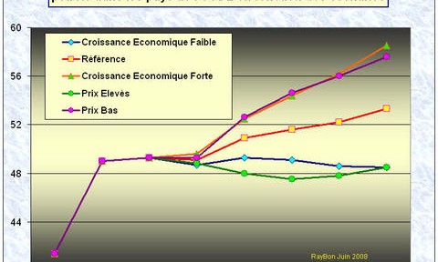 L‘Energy Information Administration vient de publier les premières données concernant son exercice annuel de prévision à l’horizon 2030, l’International Energy Outlook, version 2008. Cet exercice comporte 5 scénarios: la référence (Référence Case) qui n’est que la projection à 2030 de ce qui s’est passé depuis 2005 avec une croissance continue des productions et des consommations d’énergie, scénario catastrophe qui n’a aucun sens sinon de mettre en colère les citoyens responsables qui voudraient que le gaspillage cesse. Parmi les quatre autres cas « Croissance Economique Forte », « Croissance Economique Faible », « Prix Elevés », « Prix Bas » il n’y en a aucun qui envisage sérieusement une réduction significative des consommations de pétrole dans l’OCDE. L’hypothèse la plus « audacieuse », celle avec des prix forts ne parvient à faire réduire les consommations de pétrole de 0,1% par an entre 2005 et 2030 (FIG.).