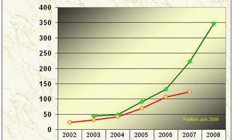 L‘European Biodiesel Board (EBB) vient de publier les résultats d’activité de cette industrie en 2007. Ils sont très décevants: les volumes produits en croissance de 17% sont passés de 4,9 millions de tonnes en 2006 à 5,7 millions de tonnes en 2007. Cette faible croissance pour une activité émergente, ne suit pas l’accroissement important des capacités de production (FIG.). Ce résultat, dans un marché du gazole européen en croissance, voisin de 200 mille tonnes par an (3,8 millions de barils/jour), montre que les unités de production européennes, essentiellement allemandes et françaises, produisent en moyenne à 60% de leur capacité de production. Biodiesel