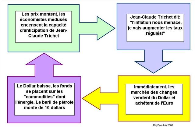 La meute des économistes et des commentateurs est en parfait accord: les cours du pétrole seront plus haut demain, rien ne peut arrêter cette ascension, les pays producteurs augmentent leurs prix(?) pour compenser la baisse du dollar. Un Président de l’OPEP, Chakib Khelil, vient pourtant de bien expliquer la puissance de « l’effet Trichet » (FIG.) qui par une simple menace d’augmentation des taux courts en Europe, déclenche une vague spéculative d’achats de « future » à New York pour se débarrasser d’un dollar qui brûle les doigts, c’est du « edging ». Mais voila, plus les cours sont élevés et plus cet exercice de haute finance devient périlleux. Alors l’effet Trichet s’amortit, ce n’est plus 10 dollars comme la fois précédente qu’a gagné le pétrole hier, mais un dollar.