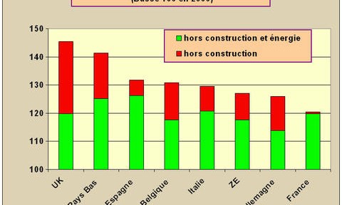 Les prix à la production de la Zone Euro du mois de Mai affichent une progression annuelle de 7,2%. Ces augmentations dans les grands pays européens varient de 6% pour l’Allemagne à 16,5% !! pour la Grande-Bretagne qui prend de plein fouet les augmentations des prix du gaz et du charbon. Hors énergie l’augmentation des prix industriels dans la Zone Euro n’est que de 3,8% variant de 2,9% pour l’Allemagne à 6,6% pour les Pays-Bas. Les variations des prix de l’énergie impactent fortement les prix industriels. Une mesure sur la période 2000 à 2008 est très simplement réalisable et notant les indices qui ont pour base 100 les valeurs de l’an 2000 (FIG.). On constate alors que l’impact des prix énergétiques (segments rouges sur la Figure) sur les hausses de prix en 8 ans, peut être considérable comme par exemple pour la Grande-Bretagne (56% de la hausse), l’Allemagne (46%), la Belgique (43%) ou pratiquement négligeable avec les 3% de contribution pour la France.