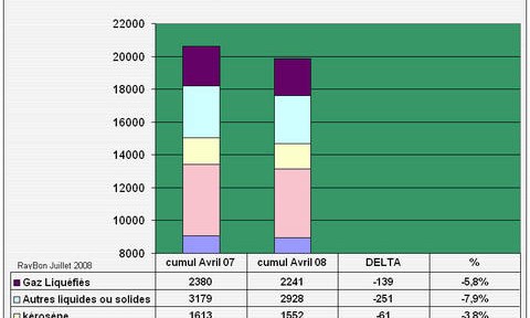 Les Etats-Unis consomment près du quart des produits pétroliers de la planète. Une grande partie de l’évolution des cours du pétrole et donc de la santé économique du monde, en ces périodes de tension des marchés et de financiarisation des cotations, dépend du comportement au quotidien du consommateur américain et de sa maîtrise du gaspillage. Les données mensuelles de l’Energy Information Administration qui font autorité, montrent qu’en cumulé depuis le début de l’année, les ventes à fin Avril de produits pétroliers avaient baissé de 3,4% par rapport à celles d’il y a un an. En terme de flux quotidien moyen, compte tenu de l’année bissextile, les ventes se sont élevées à 19851 milliers de barils par jour contre 20722 milliers de barils/jour à fin Avril 2007 soit une baisse de 4,2%. En corrigeant ces consommations des volumes d’éthanol utilisés dans les raffineries, en croissance de 20% à 547 mille barils/jour en moyenne, les volumes de purs produits pétroliers vendus sur ces quatre premiers mois ont atteint 19304 milliers de barils/jour en baisse de 4,7%.