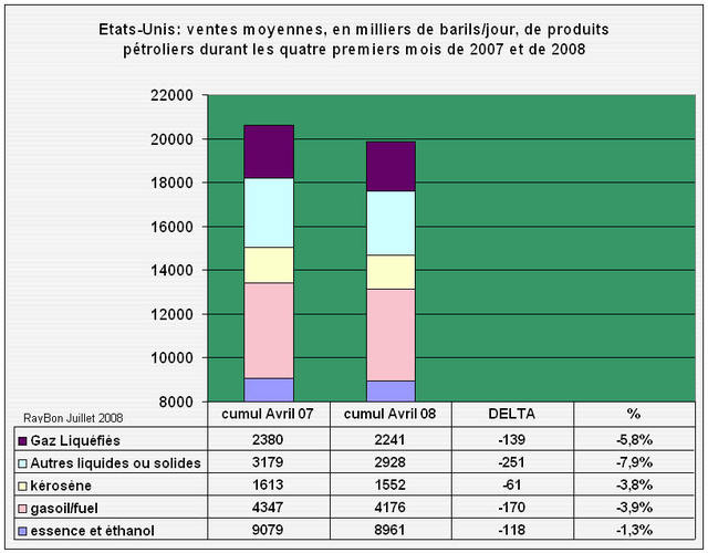 Les Etats-Unis consomment près du quart des produits pétroliers de la planète. Une grande partie de l’évolution des cours du pétrole et donc de la santé économique du monde, en ces périodes de tension des marchés et de financiarisation des cotations, dépend du comportement au quotidien du consommateur américain et de sa maîtrise du gaspillage. Les données mensuelles de l’Energy Information Administration qui font autorité, montrent qu’en cumulé depuis le début de l’année, les ventes à fin Avril de produits pétroliers avaient baissé de 3,4% par rapport à celles d’il y a un an. En terme de flux quotidien moyen, compte tenu de l’année bissextile, les ventes se sont élevées à 19851 milliers de barils par jour contre 20722 milliers de barils/jour à fin Avril 2007 soit une baisse de 4,2%. En corrigeant ces consommations des volumes d’éthanol utilisés dans les raffineries, en croissance de 20% à 547 mille barils/jour en moyenne, les volumes de purs produits pétroliers vendus sur ces quatre premiers mois ont atteint 19304 milliers de barils/jour en baisse de 4,7%.