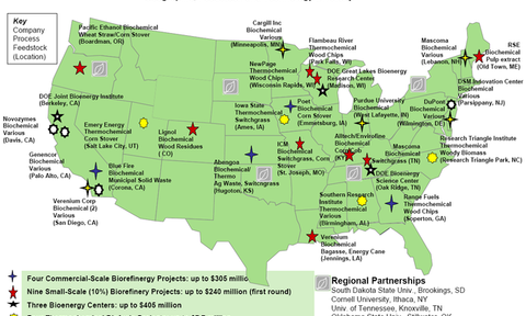 Dans la multitude des procédés permettant de passer d’une fibre de lignocellulose à un carburant liquide ou liquéfiable et pouvant être utilisé pur ou mélangé à un carburant classique, à ce jour, aucun des procédés ne se démarque nettement. Ce foisonnement de voies possibles de natures thermiques, chimiques ou enzymatiques, souvent couplées, est clairement illustré par le très grand nombre de nouveaux projets aidés par le Department of Energy américain (FIG.). Cette carte illustre la pluralité des projets qui sont aidés par l’Administration, à hauteur de 60 à 80% des dépenses. Ces procédés sont souvent complexes, lents et de faibles tailles. Ce dernier point est du à des raisons d’approvisionnement en matières premières et de logistique. De ce fait, les investissements rapportés aux volumes produits annuellement sont généralement élevés: entre 3$ et 5$ par gallon/an soit 140$ à 210$ par baril/an. Compte tenu de ces contraintes, il est possible que les futurs procédés qui seront les plus utilisés seront les plus simples, faciles à conduire, avec peu d’effluents et utilisant des matières premières locales agricoles ou de types déchets municipaux. Ce ne sont pas ces productions qui sauveront la planète. De plus grandioses réalisations nécessiteront d’immenses ressources boisées couplées à des logistiques complexes. Seules les industries du bois et de la pâte à papier auront les moyens d’organiser ce genre d’unités industrielles en nombres très limités parce qu’en concurrence avec l’industrie du papier existante. Elles seront alimentées par les sous produits du sciage par exemple. Elles non plus ne sauveront pas la planète. Dans l’élaboration des mix énergétiques futurs il est donc prudent de ne pas surpondérer l’apport des biocarburants de deuxième génération, même si le Président Bush est convaincu de l’inverse.