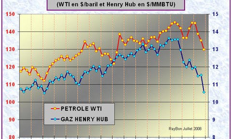 Il a été souligné ici, depuis quelques semaines, que la spéculation sur les cours du gaz et de ceux du pétrole connaîtrait une phase de retournement. Il avait été souligné que, compte tenu du caractère très spéculatif des cours du gaz sur le Henry Hub, ce sont eux qui donneraient en premier le signal de la débandade. Il semblerait que ce signal ait été clairement donné ces derniers jours, en l’absence de tornade sur le Golfe du Mexique. Un retour vers les 7 ou 8 dollars le million de BTU est du domaine du probable. Quand aux cours du pétrole ils vont dépendre de la vitesse avec laquelle les informations sur les consommations des américains vont être diffusées et relayées. Mais Jeffrey Currie et Giovanni Serio de Golman Sachs hier maintenaient toujours leur « prévision » de 149$ le baril de brut à la fin de l’année. (Notez qu’ils n’ont pas osé dire 150$ ce qui prouve que le doute a progressé, au Poker on dirait que c’est un mauvais coup de « bluff »). Il est une certitude: « les cours du pétrole ne monteront pas jusqu’au ciel » (LIRE).