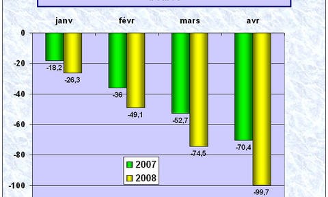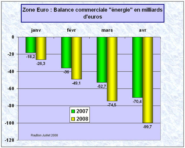 A la fin du mois d’Avril nous dit Eurostat, le déficit du poste « énergie » dans la Zone Euro atteignait 100 milliards d’euros, cumul de 4 mois à 25 milliards de déficit sur ce poste, en aggravation de 29 milliards d’euros par rapport à 2007 à la même époque (FIG.). Malgré ce handicap le déficit cumulé commercial global se maintient à moins de 10 milliards de déficit (-8,6 milliards) en raison de superbes exportations qui à 520 milliards d’euros, sont en croissance de 9% par rapport à celles de 2007. Hors poste énergie, les exportations progressent de 8% (+36 milliards) par rapport aux quatre premiers mois de 2007 alors que les importations ne progressent que de 4% (+16 milliards).