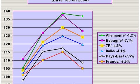Après un mauvais mois de Mars en entrées de commandes dans la Zone Euro (-3.8% par rapport à l’année précédente) suivi d’un mois d’Avril très encourageant (+12.3%) voici un mois de Mai déprimé à -4.5%. Ces statistiques d’Eurostat ne sont pas d’une fiabilité à toute épreuve et subissent quelques corrections par la suite, mais la tendance est tout de même fortement variable d’un mois à l’autre. Les entrées de commandes de la France à -8.9% par rapport au même mois de l’année précédente, ont été franchement mauvaises (FIG.). Les variations de celles des Pays-Bas et de l’Espagne ne sont guère plus brillantes. Le poste « fabrication de matériel de transport » à -10% pour la Zone Euro au mois de Mai, qui était à +10% au mois d’Avril, explique en partie ces variations subites d’un mois à l’autre. D’autres postes comme les « commandes de machines et équipements » affichent également de considérables variations.