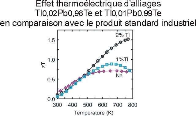 Joseph Heremans de l’Université de l’Ohio vient d’annoncer qu’il venait de faire faire un net progrès aux alliages classiquement utilisés à base de tellurure de Plomb dopés au Sodium en remplaçant le dopant par du Thallium (FIG.). Avec 2% de Thallium par rapport au Plomb il arrive à atteindre un coefficient de mérite de 1,5 aux températures proches de celles des gaz d’échappement.