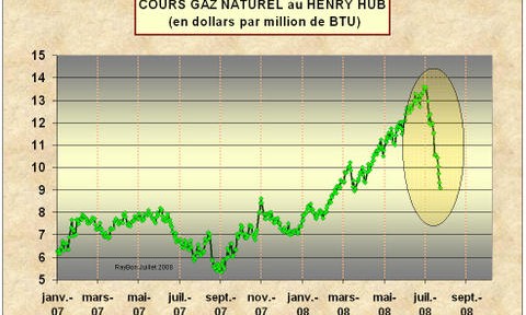 Il a été déjà souligné ici combien il est important de suivre les cours du gaz naturel sur le NYMEX, annonciateurs d’une possible évolution des cours du pétrole en raison du caractère fortement spéculatif du processus d’établissement des cours de ces formes d’énergie qui ne souffrent d’aucune pénurie, ni aux USA, ni dans le monde. Un « energy strategist » de la Société Générale, Michael Haigh, affirme que « la demande n’est pas forte » et que la Marché pourrait connaître « une fin 2008 très bearish ». Alors les cours n’arrêtent pas de chuter (FIG.) et tout le monde espère l’arrivée d’un prochain ouragan sur le Golfe du Mexique pour stopper le mouvement plongeant qui pourrait se propager sur les cours du pétrole.