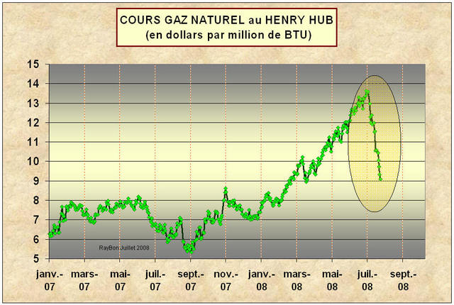 Il a été déjà souligné ici combien il est important de suivre les cours du gaz naturel sur le NYMEX, annonciateurs d’une possible évolution des cours du pétrole en raison du caractère fortement spéculatif du processus d’établissement des cours de ces formes d’énergie qui ne souffrent d’aucune pénurie, ni aux USA, ni dans le monde. Un « energy strategist » de la Société Générale, Michael Haigh, affirme que « la demande n’est pas forte » et que la Marché pourrait connaître « une fin 2008 très bearish ». Alors les cours n’arrêtent pas de chuter (FIG.) et tout le monde espère l’arrivée d’un prochain ouragan sur le Golfe du Mexique pour stopper le mouvement plongeant qui pourrait se propager sur les cours du pétrole.