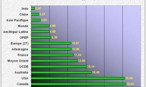 La répartition des consommations de pétrole en 2007 pour une moyenne quotidienne de 85,4 millions de barils était répartie pour 49 millions dans les pays de l’OCDE et pour 36,4 millions dans les pays NON OCDE. Les consommations annuelles de pétrole par habitant présentent de très grandes variations d’un pays à l’autre, d’une zone économique à l’autre (FIG.). Elles vont de 0,9 baril par habitant en Inde à 26 barils au Canada. La moyenne mondiale est aux environs de 5 barils par habitant, celle de l’Europe des 27 est de 11 barils, celle des pays de l’OCDE de 15 barils et chaque américain consomme plus de 25 barils par an. Devant l’ampleur de ce problème plusieurs analyses sont possibles. Il en est deux extrêmes, forcément porteuses de catastrophes, qui sont régulièrement évoquées.