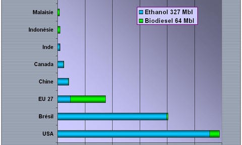 Les biocarburants n’ont pas la cote. Ils consomment des cultures vivrières de plus en plus chères qui utilisent de l’eau, menacent la biodiversité; les subventions qui les supportent coûtent cher aux contribuables et ne permettent d’économiser qu’une partie seulement du CO2 théorique, ce qui rend donc la tonne de CO2 économisée hors de prix. Oui, tout cela est vrai mais les biocarburants participent au bilan énergétique des combustibles liquides, dominés par le pétrole. Les productions mondiales en 2007, de fuel éthanol ont atteint 327 millions de barils et celles de biodiesel se sont élevées à 64 millions de barils. La production des deux carburants a donc sensiblement représenté un million de barils de pétrole/jour. L’accroissement de 25% des volumes de biocarburants produits, entre 2006 et 2007, soit 95 millions de barils, a représenté près du tiers de l’accroissement de la demande en produits pétroliers entre 2006 et 2007 (760 mille barils/jour). Les Etats-Unis et le Brésil ont produit plus des trois quarts de l’éthanol, l’Europe et les Etats-Unis ont produit plus des trois quarts du biodiesel (FIG.).