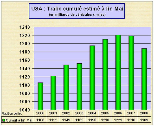 L‘Office of Highway Policy Information américain (OHPI) publie tous les mois une estimation des mouvements de véhicules sur les routes américaines. Les résultats du mois de Mai font apparaître une décroissance du trafic de 3,7% par rapport à ceux du mois de Mai de l’année précédente. En cumulé depuis le début de l’année cette décroissance du trafic sur les routes américaines ressort à 2,4% (FIG.). Ce résultat est cohérent avec les baisses de consommations d’essence observées. Si cette tendance se poursuit les résultats à fin d’année pourraient faire apparaître une chute du trafic cumulé de plus de 3%. Ces résultats montrent l’impact des prix du gallon de carburant sur le comportement des citoyens américains. Ce changement d’attitude n’a pas encore été réellement pris en compte par les prévisions officielles, ni bien sûr par les protagonistes du « peak oil » qui projettent toujours des consommations croissantes de pétrole aux Etats-Unis. Aucun papier parlant de l’indépendance énergétique des Etats-Unis qui est un sujet brûlant du moment, n’aborde l’hypothèse d’une réduction des consommations alors qu’elle va devenir évidente et qu’elle réduira d’autant les importations de pétrole ou de produits raffinés de ce pays.