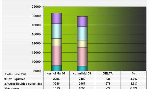 Les statistiques mensuelles de l’Energy Information Administration des Etats-Unis montrent une accentuation de la baisse des consommations en produits pétroliers au mois de Mai, par rapport à celles du même mois de l’année précédente. Les consommations quotidiennes de gasoil, de fuel et de kérosène ont baissé de 3,1%, celles d’essence de 2,3%, l’ensemble des consommations en produits pétroliers baissent de 4,4%. Ces résultats confirment, en l’accentuant, la tendance observée les mois précédents. En cumulé depuis le début de l’année (FIG.) la consommation quotidienne américaine en produits pétroliers est passée au dessous des 20 millions de barils à 19.83 millions de barils/jour, en baisse de 877 mille barils/jour par rapport à 2007. Après déduction des ajouts de fuel éthanol cette baisse atteint même 1,04 millions de barils/jour, soit 5% par rapport à celle de l’an dernier.
