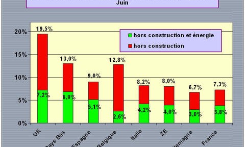 Eurostat informe que les prix industriels (hors construction) de la zone euro ont augmenté au mois de Juin dernier, de 8%. Cette augmentation sans les prix de l’énergie n’est que de 4% (FIG.). Le trophée ce mois-ci revient à la Belgique dont les accroissements de prix hors énergie très maîtrisés à 2,6% sont multipliés par cinq avec les prix de l’énergie. A 12,8%, les quatre cinquièmes de l’augmentation des prix belge provient de l’énergie. Les autres victimes des prix du gaz naturel de la Mer du Nord sont les Pays-Bas et la Grande-Bretagne. Cette dernière affichant un chiffre record de hausse des prix industriels annuels proche de 20% dont près des 2/3 proviennent des prix de l’énergie. Heureusement que la part de l’industrie dans l’économie anglaise n’est pas très importante. La France à 7,3% et l’Allemagne à 6,7% d’augmentations apparaissent comme les bons élèves de la Zone Euro.