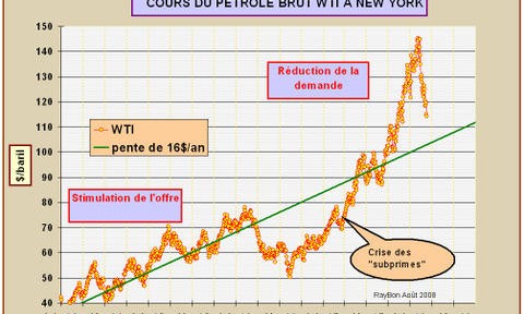 Les cours du baril de pétrole ne « s’effritent » pas comme l’annoncent les divers médias. Ils rejoignent des cours plus réalistes après un moment de folie des marchés aiguillonnés par des prévisions farfelues de soi-disant experts en énergies (trop proches des banques émettrices de papiers sur les « futures » pour être totalement objectifs) et alimentés par les liquidités errantes issues de la crise des « subprimes ». Cette poussée de fièvre aura permis au Marché du pétrole de comprendre (espérons-le!) un certain nombre d’évidences: