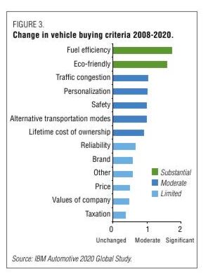 Dans une étude prospective, basée sur l’interview de 125 dirigeants de l’industrie automobile mondiale ou d’activités proches, les équipes d’IBM Institute for Business Value viennent de publier un rapport intitulé « La clarté après le chaos » sur leur vision de l’industrie automobile, des produits et services proposés à l’horizon 2020. « Dans les dix ans à venir nous connaîtrons plus de changements que durant les 50 dernières années passées » déclare un des patrons européens interviewé. Il ressort de cette étude que les deux principales motivations qui vont essentiellement déterminer le choix des consommateurs seront la consommation en carburant (fuel efficiency) et le respect écologique du véhicule (FIG.). Toutes les personnes interrogées pensent que les nouveaux véhicules en 2020 comporteront une part hybride dans leur mode de propulsion et que la maîtrise du stockage d’énergie sera un point clé du développement. Les batteries de type Li-Ion sont privilégiées dans cette approche. Les Piles à Combustibles trop chères et nécessitant des infrastructures de distribution d’hydrogène resteront marginales. La part des biocarburants, issus de cultures non alimentaires, sera en croissance.