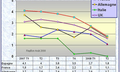 L’Espagne tout d’abord (courbe rouge), en décroissance depuis un an, soutenue à bouts de bras par des dépenses des administrations très élevées, mais dont l’activité et la consommation des ménages s’affaissent. La Grande-Bretagne (courbe parme) dont l’économie souffre de la crise bancaire, d’une inflation galopante des prix de l’énergie (gaz et charbon) et d’une baisse du tourisme. L’Italie (courbe verte) qui avait déjà chuté au quatrième trimestre de l’an dernier et affiche un zéro pointé. La France (courbe bleue) dont l’activité languissante traduit sa perte de compétitivité industrielle, aggravée par un euro surévalué qui décourage tout nouvel investissement de capacité de production sur notre sol. L’Allemagne enfin (courbe noire) dont l’activité économique est laminée par une progression du niveau de consommation des ménages très faible et même parfois en retrait, comme au quatrième trimestre 2007.