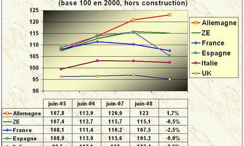 Tout comme au mois de Mai, l’Allemagne se singularise parmi les grands pays européens en conservant une production industrielle en croissance (FIG.). Depuis deux mois consécutifs les données d’Eurostat indiquent des productions industrielles, par rapport au même mois de l’année précédente, pour la Zone Euro globalement en décroissance (Mai: -0.6%, Juin: -0.5%). Parmi les grands pays européens c’est l’Espagne qui voit sa situation le plus se dégrader avec une chute de -5.5% au mois de Mai, aggravée à -9% au mois de Juin. L’embellie espagnole est passée, l’éclatement de la bulle immobilière se propage.