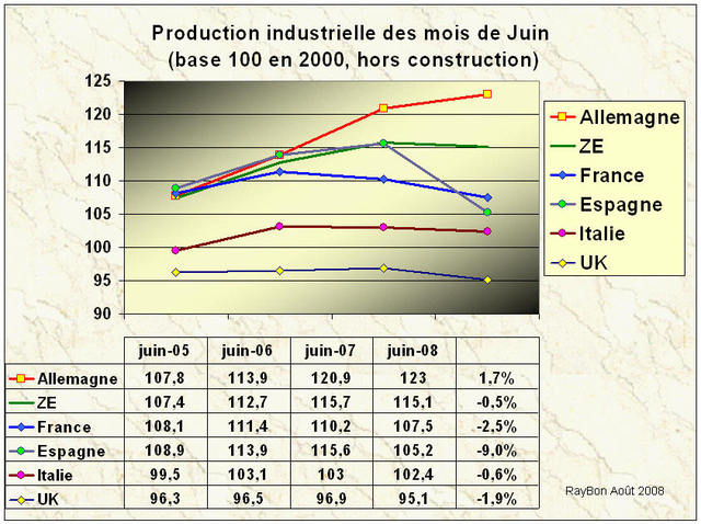 Seule l’Allemagne avec une légère croissance, par rapport à il y a un an, de l’activité industrielle de 0.9% en Mai et de 1.7% en Juin sort la tête de l’eau, mais on est loin des 5% à 6% de croissance du début de l’année.