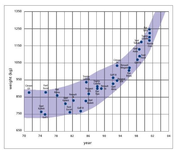 Depuis des décennies, malgré l’optimisation des coûts et des matériaux utilisés, on assiste à une lente et inexorable montée en masse des véhicules (FIG.), plombés le plus souvent par des fonctions annexes de confort tels que l’air conditionné ou par des modes « tout terrain » faisant appel à de vastes habitacles décorés de chromes rutilants et juchés haut sur pattes. L’utilisation de l’Aluminium trois fois plus léger que l’acier permet sensiblement de réduire par deux la masse des pièces, plus volumineuses à propriétés mécaniques constantes. En moyenne il doit y avoir 140 kg d’aluminium dans les voitures récentes, soit 10% de leur masse environ. De techniquement prestigieuses voitures ont été construites, en utilisant largement l’aluminium de la Dyna Panhard de nos grands-pères (incroyable prouesse technique pour l’époque) à l’AUDI A2 qui était constituée à 34% de sa masse en Aluminium mais dont le flop commercial a entraîné l’arrêt de production en Juillet 2005. Les précurseurs ont toujours tort.