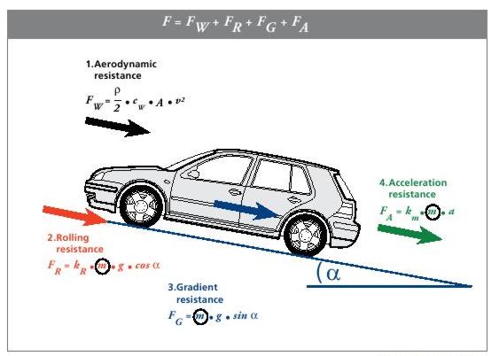 La masse d’une voiture est un des paramètres majeurs qui déterminent sa consommation en carburant. Pour acquérir une certaine vitesse le véhicule va devoir vaincre quatre forces dont trois dépendent de sa masse : si la résistance à la pénétration dans l’air est indépendante de la masse du véhicule, la résistance à l’accélération, la résistance au roulement et le gain en énergie potentielle en côte dépendent de la masse (FIG.). Son énergie cinétique acquise est proportionnelle à la masse.
