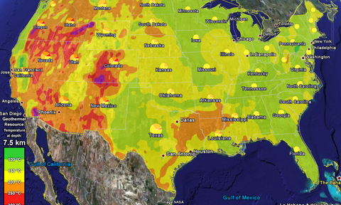 La géothermie est largement développée en Islande ou elle fait l’objet d’investissements importants. L’électricité générée à partir de l’eau chaude sous pression extraite des couches géologiques est si peu chère que l’Islande est devenue un grand producteur d’Aluminium de première fusion dans le monde, avec l’aide d’usines d’électrolyse récentes, au top de la technologie (LIRE). Les Etats-Unis possèdent des ressources géothermiques importantes situées à l’ouest du pays (FIG.). Elles sont potentiellement une source d’énergie exploitable par injection d’eau dans les roches dont la température peut atteindre 300°C selon le procédé « Enhanced Geothermal System » (EGS) qui fragmente la roche en sous-sol et permet de récupérer en boucle l’eau chaude sous pression. Le très fortuné Google a décidé de mettre plus de 10 millions de dollars au pot pour sponsoriser ces développements dans les Sociétés AltaRock Energy et Potter Drilling, ainsi que pour aider les recherches universitaires destinées à préciser les réserves géothermiques américaines.