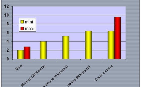 Le Service de Recherches de l’Agriculture américain a mené des essais en vraie grandeur de culture simultanée de maïs, de manioc (cassave) et de patate douce dans les Etats de L’Alabama et du Maryland. Les résultats des récoltes exprimées en carbohydrates à l’hectare sont sans appel: les rendements de patate douce surpassent et de loin ceux du maïs. La patate douce présente un intérêt supplémentaire, elle contient des sucres pour environ 30% qui produisent plus d’éthanol que l’amidon. Un calcul partant des récoltes à l’hectare pour évaluer le rendement en éthanol final conduit donc à des résultats très favorables à la patate douce dans les deux Etats et acceptables pour le manioc en Alabama (FIG.).