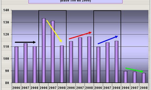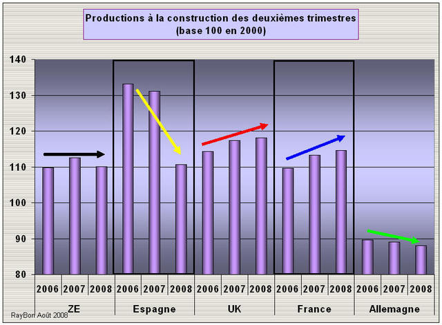 Eurostat vient de publier les résultats de production à la construction des divers pays européens au deuxième trimestre. Par rapport aux propos alarmants de certains commentateurs économiques ces résultats consolidés au niveau de la Zone Euro ne sont pas aussi catastrophiques que prévus ou qu’annoncés. A 110 points (basse 100 en 2000) ils ressortent en retrait d’un peu plus de 2% par rapport au même trimestre d’il y a un an et étales par rapport à il y a deux ans. Ces résultas (FIG.) sont tirés vers le bas par les contre performances de l’Espagne, en perte de 21 points en un an et de celles de l’Allemagne dont le niveau très bas n’empêche pas une poursuite du ralentissement. Avec une construction aussi atone on devine mal comment l’Allemagne peut radicalement modifier l’efficacité énergétique de ses bâtiments collectifs ou de ses maisons. Par contre la Grande-Bretagne et la France conservent encore un certain dynamisme dans la construction sur le deuxième trimestre. Cette tendance est toujours vraie au mois de Juin pour la France (+1.7%), par contre la Grande-Bretagne semble amorcer un mouvement de déclin de l’activité (-4.7%).