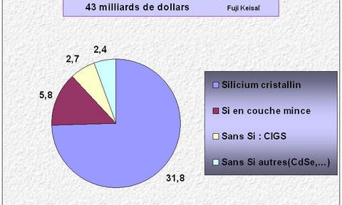 Le marché mondial des panneaux photovoltaïques a connu des croissances de 40% par an depuis des années. Une étude conduite par le japonais Fuji Keisai prévoit que cette croissance va se poursuivre. Par rapport aux chiffres de 2007, ce bureau d’études prévoit un marché mondial en 2012 atteignant les 43 milliards de dollars, soit près de 4 fois la taille du Marché 2007 (11.8 mrds$). En fonction des technologies, le Silicium cristallin conserverait encore les trois quarts du Marché avec près de 32 mrds$ soit trois fois celui de 2007 (10.6 mrds$). Les technologies à couches minces connaîtront une progression plus rapide avec une multiplication par 11 pour le Silicium en couche mince et par 7,5 pour les techniques sans Silicium. Le Marché 2012 verra donc les technologies solaires sans Silicium atteindre 5,1 mrds$, soit 12% du Marché global (FIG.). La technologie CIGS (Cuivre Indium Gallium Selenium) aura une part prépondérante dans cette catégorie avec 2,7 mrds$.