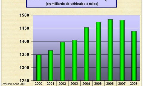 Les données du trafic routier publiées par l’Administration américaine concernant le mois de Juin confirment et amplifient les tendances des mois précédents: le trafic a baissé de 4,7% par rapport à celui du mois Juin 2007. Cette baisse était de 3,7% au mois de Mai (LIRE). En cumulé depuis le début de l’année la baisse de trafic est de 2,8% par rapport à celui du premier semestre 2007 (FIG.). Ce résultat permet d’anticiper des publications de consommations d’essence mensuelles en baisse par l’Energy Information Administration pour le mois de Juin.